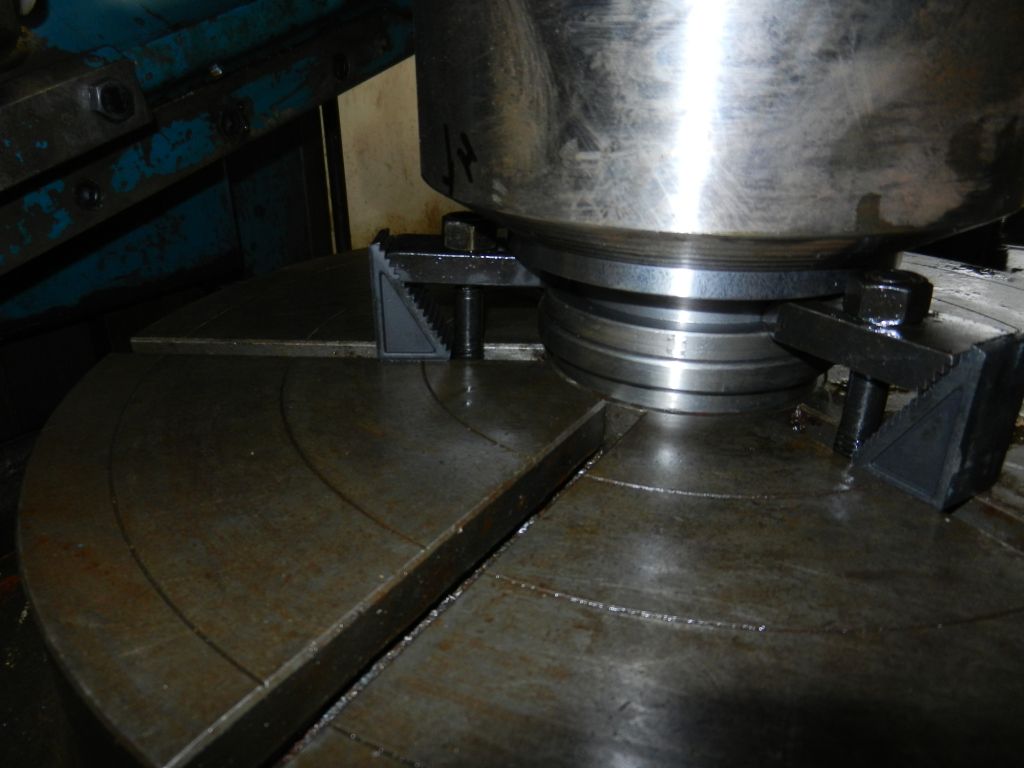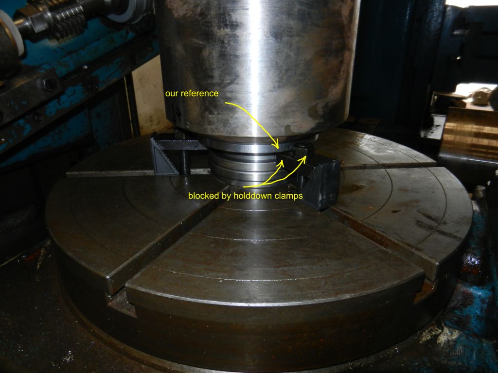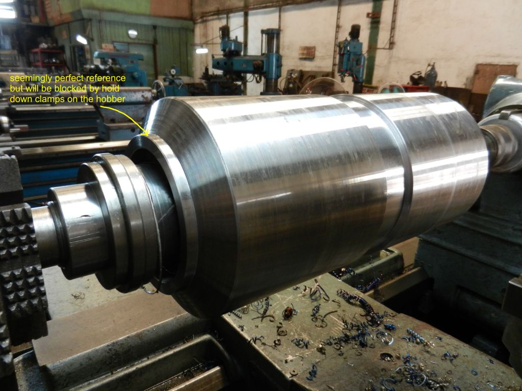 INTRODUCTION: The following is an article on an important aspect of gear making that, once encountered at the hobber, may be too late. Planning surfaces that a dial indicator "could love" is the purpose of Mr. Lehman's excellent contribution. As he points out, not every situation will necessarily fit into the case study he shows here, but planning for alignment should be foremost in your mind before you commit steel to the lathe's turning tool. Thinking Ahead about Run Out It is not critical that the outside diameter (OD) of a gear be exactly concentric with the axis of rotation - OD is only important in that the tops of teeth cannot bottom in the mating member. The important alignments are pitch cylinder and axis of rotation. This is true for all gears and pinions. Runout is the combined effect of misalignment of pitch cylinder with its axis of rotation. So it is critical that the pitch cylinder be exactly concentric and parallel with the axis of rotation. Since both pitch cylinder and axis of rotation are imaginary, we must employ a "trick". We don't need to "see" either one as long as we align the hobber axis parallel and concentric to the gear blank. Alignment requires special gear blank surfaces that can be used as references that are concentric and parallel to the all-importance pitch cylinder once the teeth are cut. We will rely on these surfaces for all subsequent operations that must be aligned to the pitch cylinder. These surfaces are called "Reference" surfaces and the ability to accurately indicate to them determine the accuracy of the fininshed gear. So, in more ways than one, accuracy begins when you machine the blanks and add machined (or ground) reference surfaces. It should be noted that the usual practice is to grind (possibly machine) the bearing journals as the last step in making the gear. To locate the gear accurately it follows that we must have surfaces we can indicate to. Sound familiar? These are the same surfaces we used to align the blanks to the hobber table. Reading on, you will see examples of "Face" and Rim" reference surfaces for axis of rotation and pitch cylinder. It is tempting to use the OD and Face as reference surfaces but factors can and will conspire to offset/misalign both OD and Face of a gear from its final axis of rotation. You might use the OD to dial indicate the gear blank on the hobber, but once teeth are cut the OD is, for all practical purposes, lost as a reference surface for the pitch cylinder. Having a smooth reference boss/land/groove/step that will be concentric with the pitch cylinder is a tremendous PLUS when moving a gear through its many stages (set ups) of manufacture. So, if at all possible, plan your gear with references that you can use and follow until the gear is finished. Even if these references are not part of the original gear design you can always find a way/place to add them. And, when you plan the references, you need to anticipate each set up of the manufacturing process. Take a look at the first picture:it shows a seemingly perfect reference when viewed on the lathe - but on the gear hobber this reference is blocked by hold-down clamps: