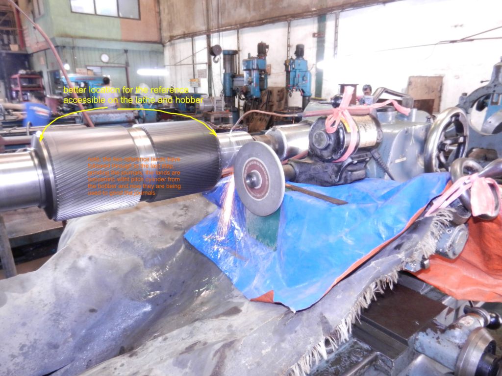 The next picture shows the proper location of the reference lands. It also shows how these lands are used to establish the final reference for grinding the journals - making the pitch cylinder concentric with the axis of rotation.