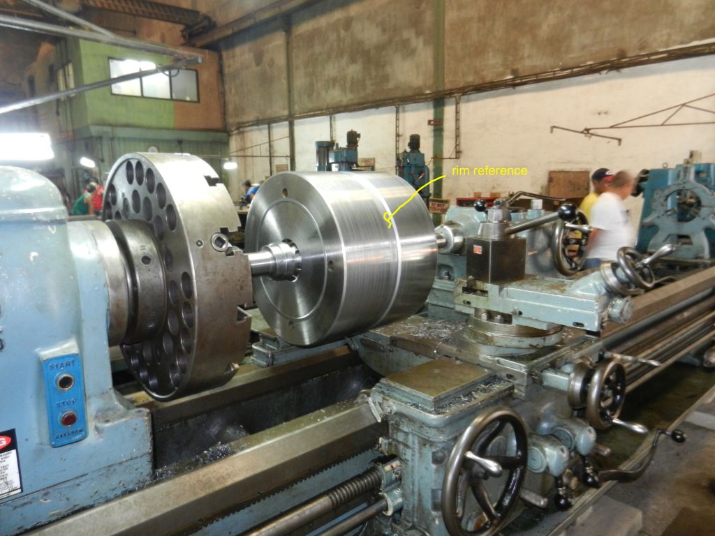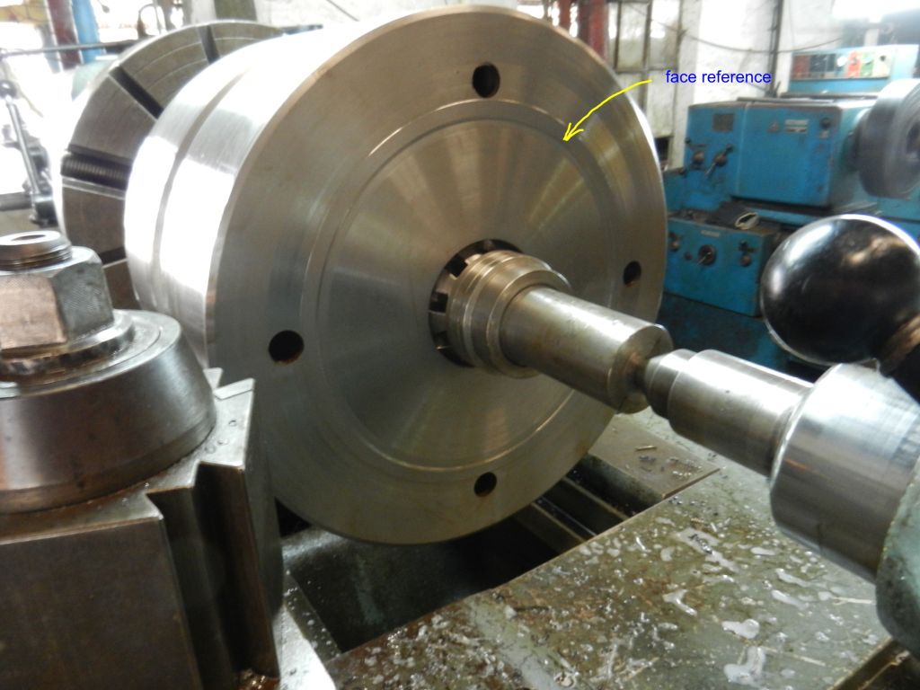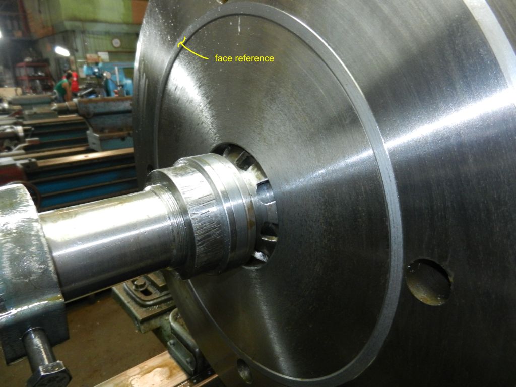 In planning the reference(s), one must give careful consideration to how the geometry of the reference(s) will play out in the various mounting configurations (set ups) as the gear moves through the manufacturing process. The diameter of the herringbone pinion in the picture above, is much less than the length (face width) of the pinion. The reference locations (shown in this picture) are perfect for aligning the gear. For a gear with a diameter equal to or greater than the width of the gear, one must use a more suitable reference system. Pictures below illustrate a "face and rim" reference system: